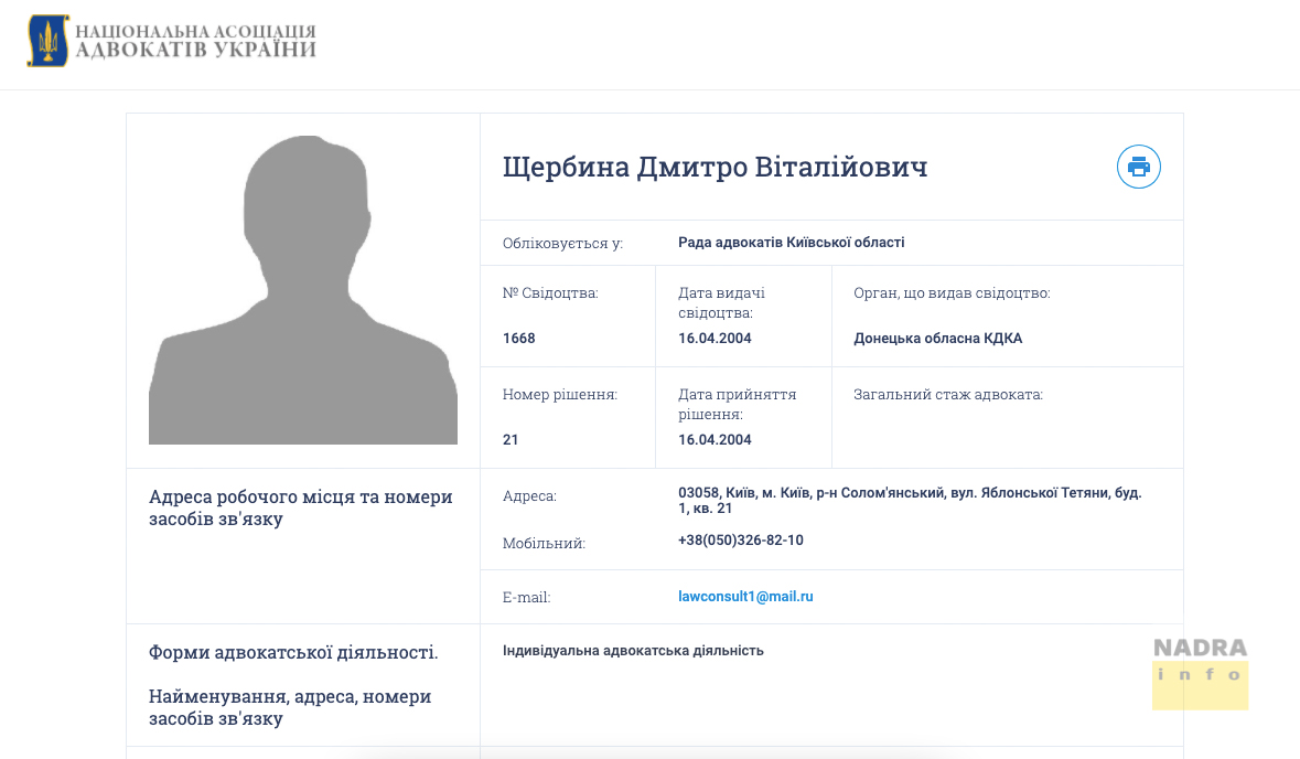 Зауважимо, в Єдиному реєстрі адвокатів України міститься інформація про адвоката Щербину Дмитра Віталійовича. Це єдиний адвокат в реєстрі з такими ж ініціалами, що і в рішенні суду. Свідоцтво №1668 про право на зайняття адвокатською діяльністю було видано в 2004 році Донецькою обласною КДКА, а в контактах вказано електронну пошту в домені mail.ru, забороненому для використання на території України.