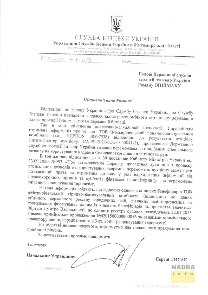 Формальна підстава сформульована в Наказі Голови Державної служби геології та надр України Романа Опімаха №569 від 04.08.2021: “У зв’язку з надходженням інформації від правоохоронних органів та суб’єктів фінансового моніторингу, що переможець аукціону здійснює фінансування тероризму в Україні … позбавити ТОВ “Межиріченський ГЗК” права на отримання спеціального дозволу на користування надрами”.