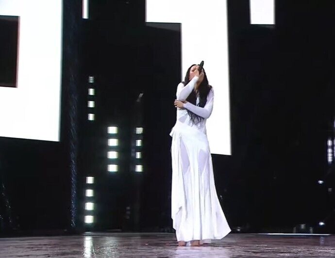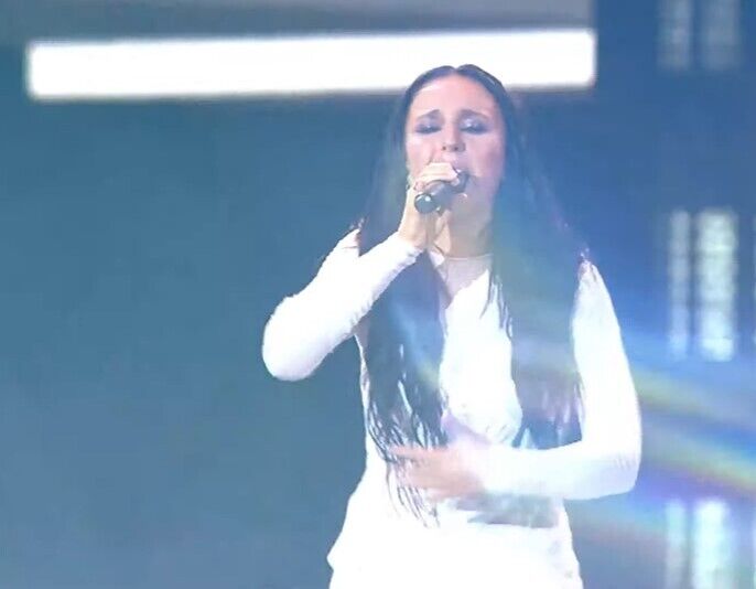 Артистка Оля Полякова продемонстрировала нежное исполнение украинской песни "Сіла птаха". Она появилась на сцене в белоснежном обтягивающем наряде и в тон к нему был подобран головной убор.
