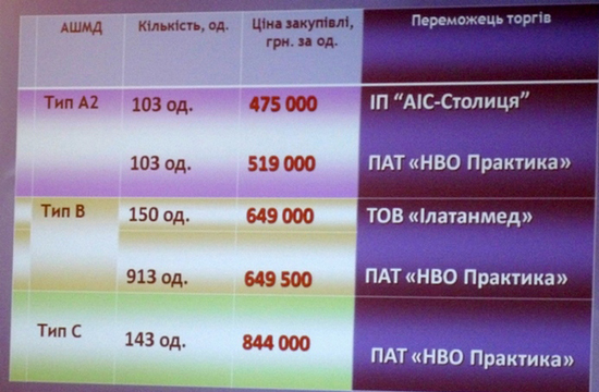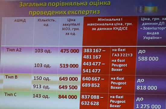 За результати тендера міністерство заплатило за 103 машини типу "А2" 475 тис грн за штуку, за 103 машини "А2" - 519 тис грн за штуку, за 1 063 машини типу "В" - 649-649,5 тис грн за штуку, і за 143 одиниці типу "С" - 844 тис грн за штуку.