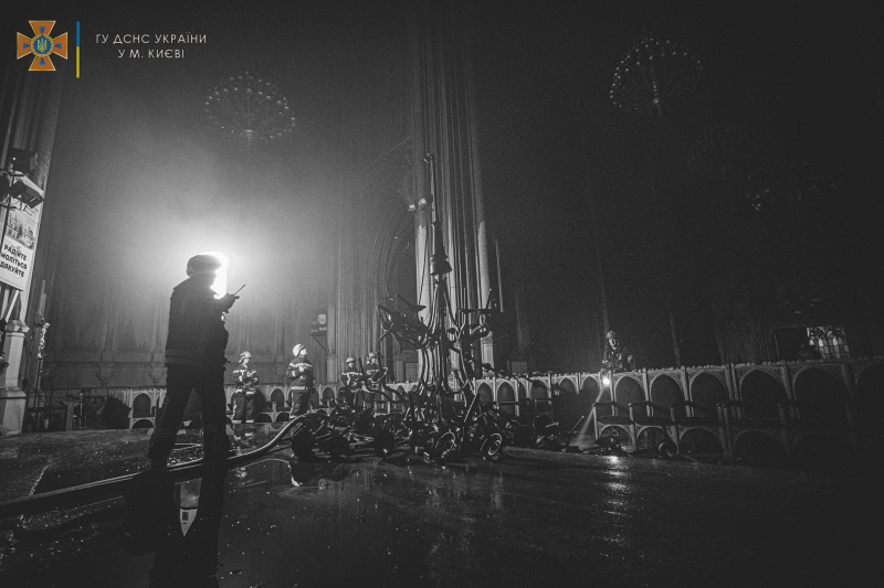 Опубликованы фото вчерашнего пожара в костеле Святого Николая в Киеве. На снимках видно, как спасатели тушат пожар, а также последствия, которые повлек огонь внутри здания.