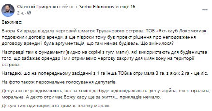 Киевсовет отдал очередной кусок Труханова острова частной фирме, - Гриценко