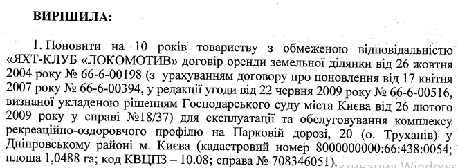 Вчера, 7 октября, на сессии Киевсовета, депутаты отдали 91 голос за решение о продлении аренды ООО “Яхт-клуб Локомотив” участка площадью в 1 га на Трухановом острове. Ранее столичные власти намеревались его забрать, так как ООО не использовало землю по целевому назначению – для обслуживания и эксплуатации комплекса рекреационно-оздоровительного профиля. Проверками было установлено, что от здания на территории в наличии лишь фундамент.