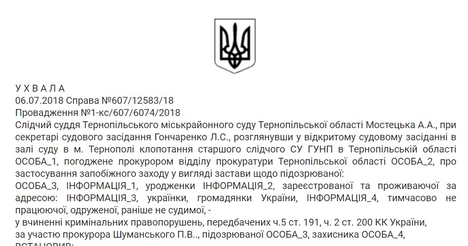 В производстве СУ ГУНП в Тернопольской области расследуется уголовное производство №12018210000000175 от 28 февраля 2018 года по признакам уголовных преступлений, предусмотренных ч. 5 ст. 191, ч. 1, 2 ст. 200 УК Украины.
