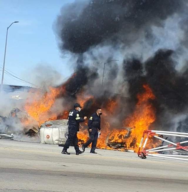 #ÚltimaHora 🚨 Tráiler se queda sin frenos y embiste varios automóviles; provocando un incendio en el lugar.