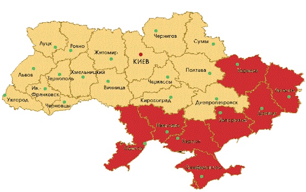 Красным отмечены регионы Украины, которые могут отойти к России. Например, в виде Юго-Восточной республики или в качестве новых российских губерний, которые присоединятся к России через специфический референдум.