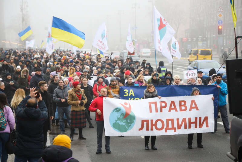 Сейчас протестующие идут маршем по Крещатику. Для них выделили крайних две полосы.