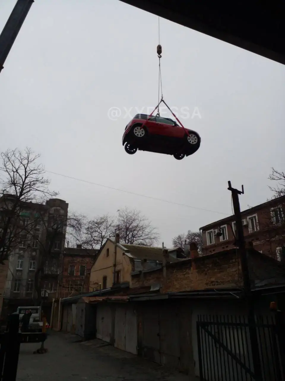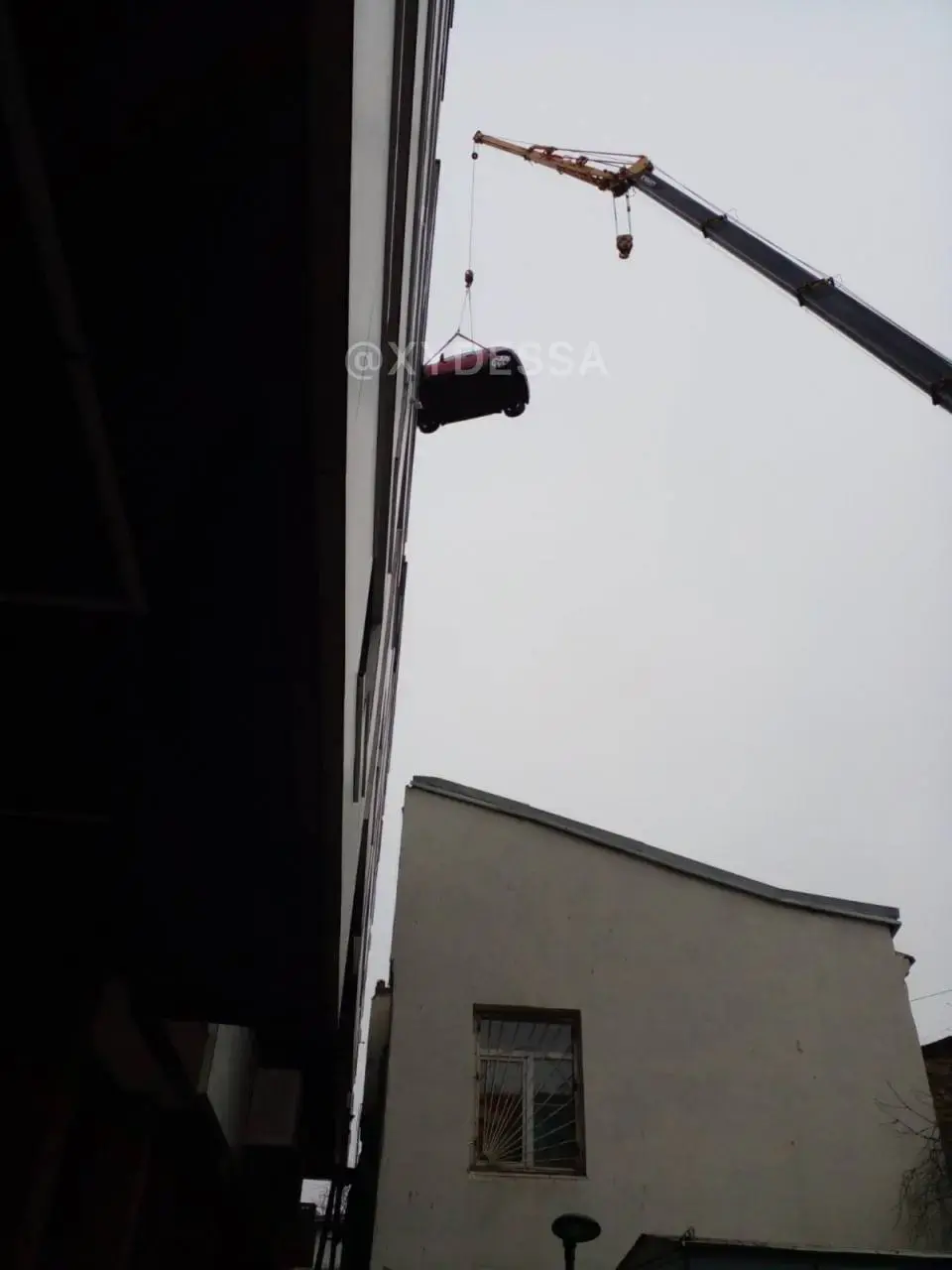 Необычную картину одесситы наблюдали на улице Кузнечной. Машину на балкон поднимали с помощью подъемного крана.