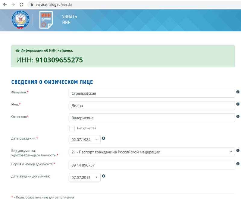 Баби на лавках, ті, що майстри гри у «Спортлото», допомогли мені підібрати «виграшні» комбінації цифр на сайті Федеральної податкової служби РФ. І ось що з’ясувалося: В’ячеслав Стрелковський та Діана Стрелковська мають чинні російські паспорти та індивідуальні податкові коди платників податків! Будь-ласка, оце чинні реквізити паспорта громадянина РФ та індивідуального податкового номеру РФ Діани Стрелковської: