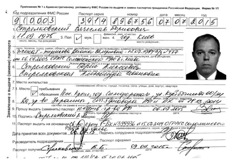 У результаті відкрилась наступна картина. Обидва – і В’ячеслав Стрелковський, і його законна дружина Діана Стрелковська, у Росії діяли спільно та узгоджено. Обидва пройшли натуралізацію та 07.07.2015 отримали паспорти у «Відділі УФМС Росії в Республіки Крим у Київському районі м. Сімферополя». При цьому і В’ячеслав Борисович, і Діана Валеріївна власноруч вказали один одного в якості чоловіка і жінки.