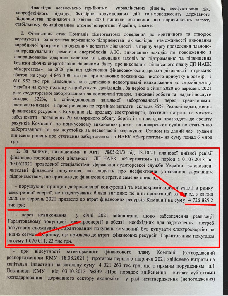 Підтвердженням цьому слугують результати перевірки ДП НАЕК «Енергоатом», проведеної Державною аудиторською службою України, подані на розгляд Ради з національної безпеки та оборони. За результатами ревізії, відповідно до акту, датованого 13 жовтня 2021 року, під час планової ревізії встановлено численні факти фінансових порушень. Загальна сума втрат, яких зазнала держава, по-справжньому вражаюча! За період з квітня 2020 року це майже 6 мільярдів гривень.
