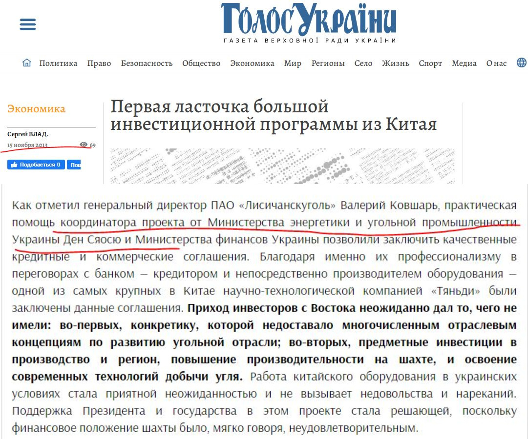 Одиозный мошенник позиционирует себя как китайский инвестор и авторитетный спец по импорту. Только вот реальность далека от сказочного самопиара. Еще во времена легитимного, тогдашний министр энергетики Ставицкий назначил Сяосю координатором государственной программы замещения природного газа каменным углем. Когда данная тема стала «крайне не актуальной», её быстро зачистили в глобальной паутине. Только вот такая неудобная информация осталась не только в печатном виде в газете…