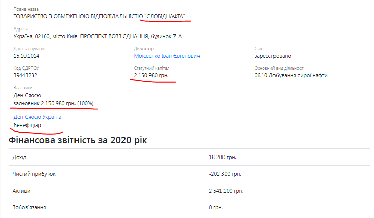 Статусный капитал – более 2,15 миллиона гривен. Единственный основатель и бенефициар опять же Ден Саосю.