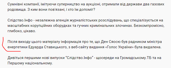 Добавим, что журналисты тогда обратили внимание аудитории на то, что после выхода скандального и разромного расследования, информацию о том, что Сяосю был советником министра энергетики Ставицкого, с сайта «Голос Украины» оперативно снесли.