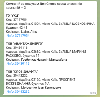 Очередной примечательный момент. Телефон, который официально указан в «Слобіднафта» в качестве контактного, принадлежал столичной компании «Китпред» (расшифровывается как «Китайское представительство»). Эта компания продавала запасные части для китайских машин.