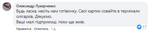 "Пожалуйста, несите нам наличные деньги. Свои карточки совайте в терминалы олигархов. Спасибо. Ваши малые предприниматели пока еще живы", - реагирует на случившееся другой пользователь.