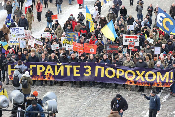 Люди несут большой баннер "Не играйте с Порохом" и выкрикивают "Володя, мы к тебе идем".