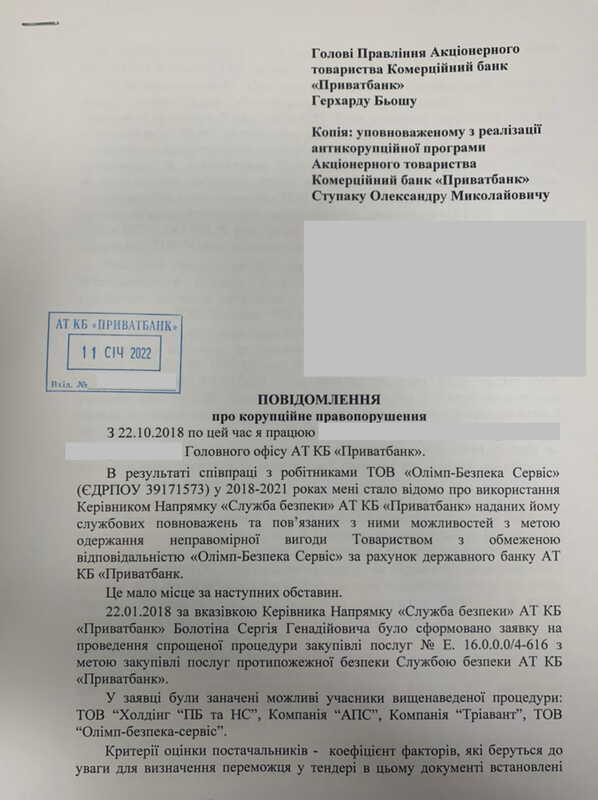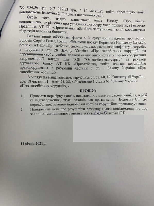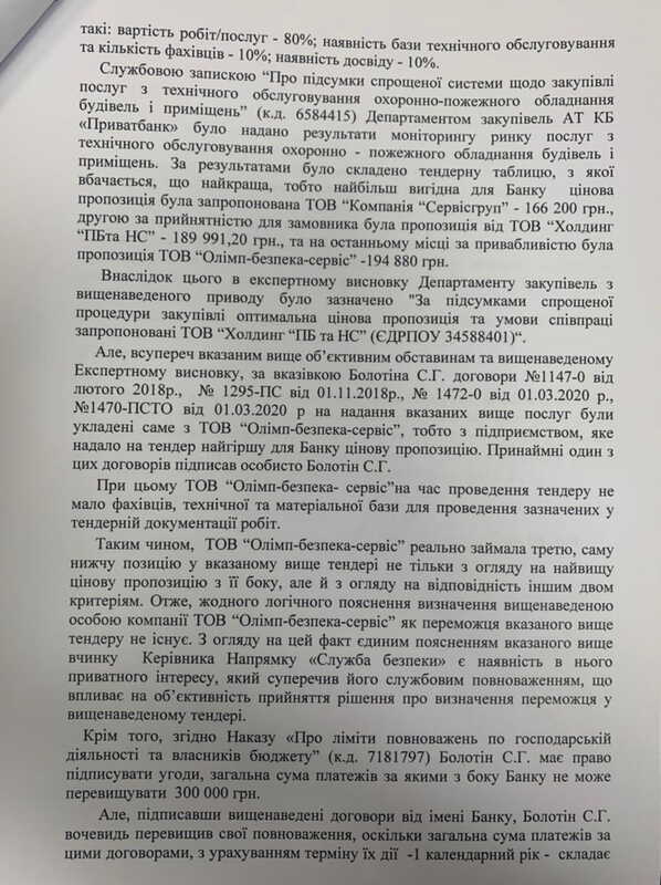 Профсоюз сотрудников безопасности ПриватБанка опубликовал сообщение о коррупции, согласно которого Руководитель Службы Безопасности Болотин Сергей Геннадиевич в 2018 году вопреки заключению тендерного комитета превысил свои полномочия и заключил договора с ООО «Олимп Безпека Сервис» на оказания услуг противопожарной сигнализации, ценовые предложения которой были гораздо выше других участников конкурса. Профсоюз утверждает о наличии 15 эпизодах подобных коррупционных нарушений.