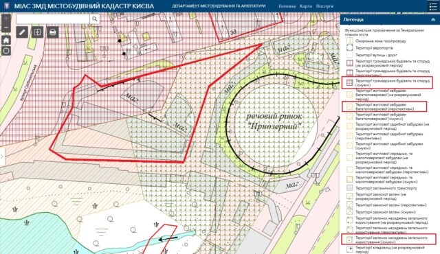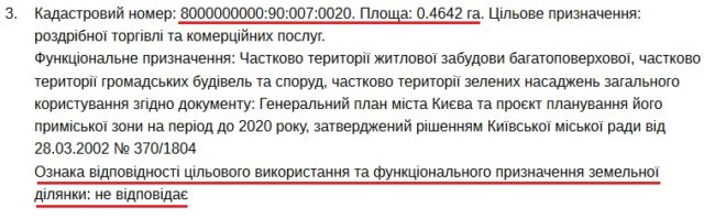 Так, її цільове призначення – для роздрібної торгівлі та комерційних послуг, а функціональне за Генпланом – частково території житлової багатоповерхової забудови, частково території громадських будівель та споруд, частково території зелених насаджень загального користування. При чому «житлова забудова» займає менше третини ділянки.