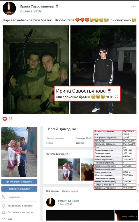 «Приходько Сергей Васильевич (18/06/93, Донецк) стал #груз200 28/01/22 (обстоятельства требуют уточнения) #роа», — говорится в сообщении.