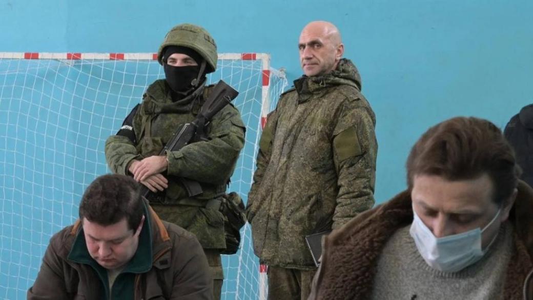 «Свежие фотографии. Оккупанты стоят за спинами людей, которых согнали на сборный пункт военного комиссариата в школу № 19 города Донецка», — написал один из Телеграм-каналов.