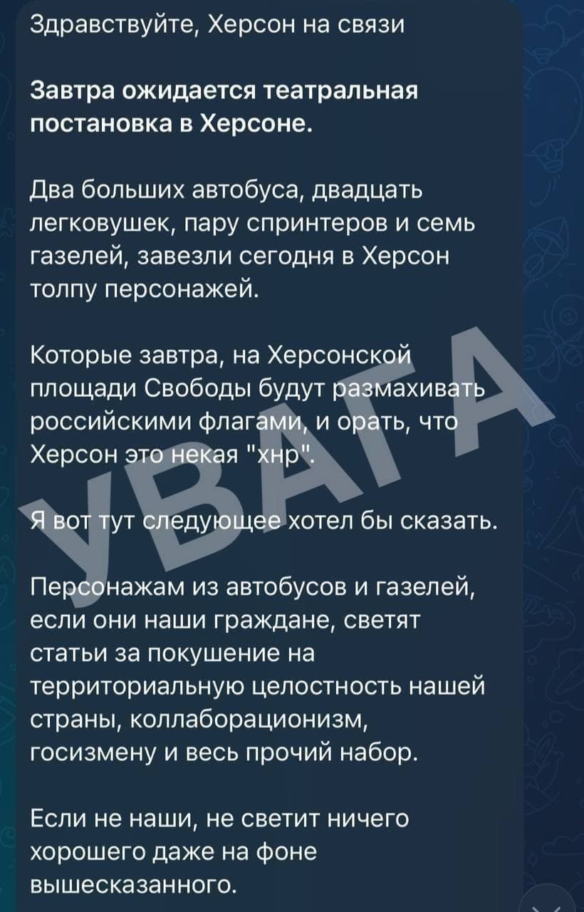 "Для этого в город свозят 2 больших автобуса, 20 автомобилей, 2 спринтера и 7 "ГАЗелей". Обращаемся к жителям города Херсон! Не дайте себя обмануть! Не подходите близко к этой массовке! Не верьте фейкам!" - отметили в сообщении.