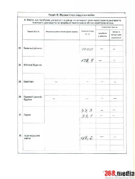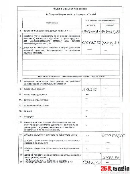 Доход чиновника за весь 2014 год составил 194 тыс. гривен, из которых 129 тыс. гривен пришлось на его зарплату. Остальное он получил в качестве пенсии. Его супруга заработала всего 41 тыс. гривен, а еще 300 тыс. гривен получила от отчуждения имущества.