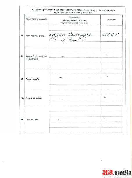 «Паркетный внедорожник» Hyundai Santa Fe 2009 года записан на жену Кульбако. Видимо, муж добирается или на служебной машине или на трамвае. Вероятно, талоны на бензин, переданные ему в качестве взяток, он хранил для своей благоверной. К слову, стоимость подержанной иномарки этого года выпуска составляет в наше время от 16 до 18 тыс. долларов, что в три раза превышает зарплату чиновника.
