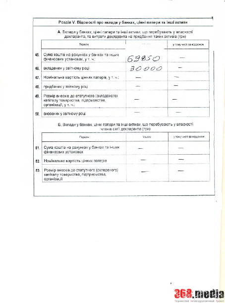 Жена, конечно же, побогаче. Она владеет земельным участком в два гектара, дачным домом (33,6 кв. метра), а также квартирой (65 кв. метра) и другой недвижимостью (433 кв. метра). В какую сумму обходиться семье Кульбако содержание вышеперечисленного имущества остается загадкой, так как в налоговой декларации по этому пункту стоит многозначительный прочерк. Сумма на банковских счетах Виктора Кульбако составляет почти 70 тыс. гривен, из которых 30 тыс. гривен появились только в прошлом году.
