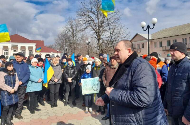 Микола Різак, мер Таврійська на мітингу проти вторгнення рф, 7 березня 2022 року Фото: Український південь