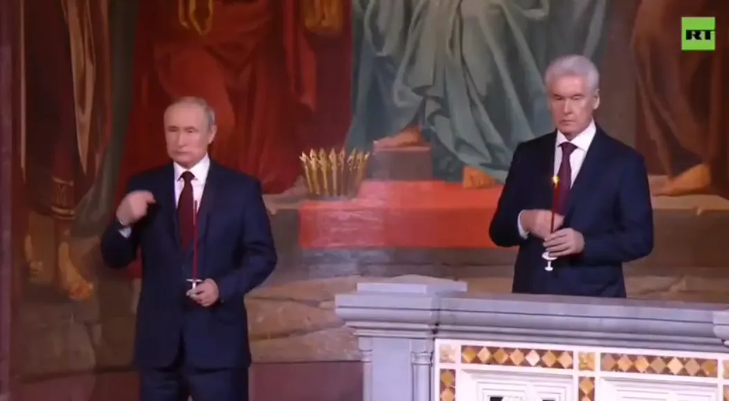 "В Пасхальную ночь что-то неладное с Путиным происходило на видео из Церкви", - пишут авторы канала, публикуя фрагмент трансляции богослужения, показанный на пропагандистском канале "RT на русском".