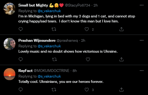 "Прекрасная музыка и, бесспорно, показывает, насколько победоносна Украина", "Очень круто. Украинцы, вы наши герои навеки", "Я нахожусь в Мичигане, лежу в постели со своими 3 собаками и 1 кошкой и не могу перестать плакать. Я не знаю этого человека, но я люблю его", – говорится в сообщениях.