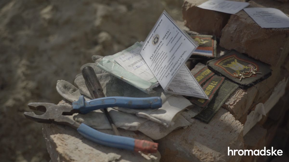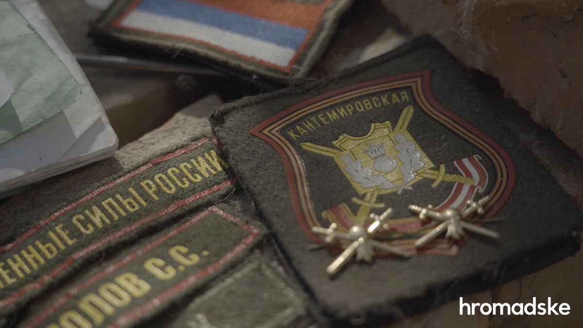 Максим выносит из дома несколько вещей, которые он хранит для следователей — шевроны «4 танковой Кантемировской дивизии Московской области», которая стояла в Тростянце, заламинированный документ с «телефонами доверия», медицинские книги россиян.