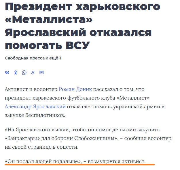 «На Ярославского вышли, чтобы он помог деньгами закупить «байрактары» для обороны Слобожанщины», – сообщил волонтер Роман Доник на своей странице в соцсети. «Он послал людей подальше», – возмущается активист».