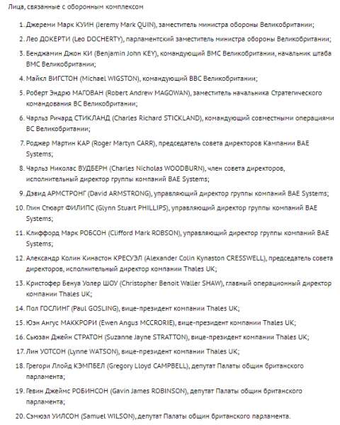 В списке оказались, в частности, заместитель министра обороны, командующий и начальник штаба ВМС, три члена парламента и руководители оборонных компаний BAE Systems и Thales UK.