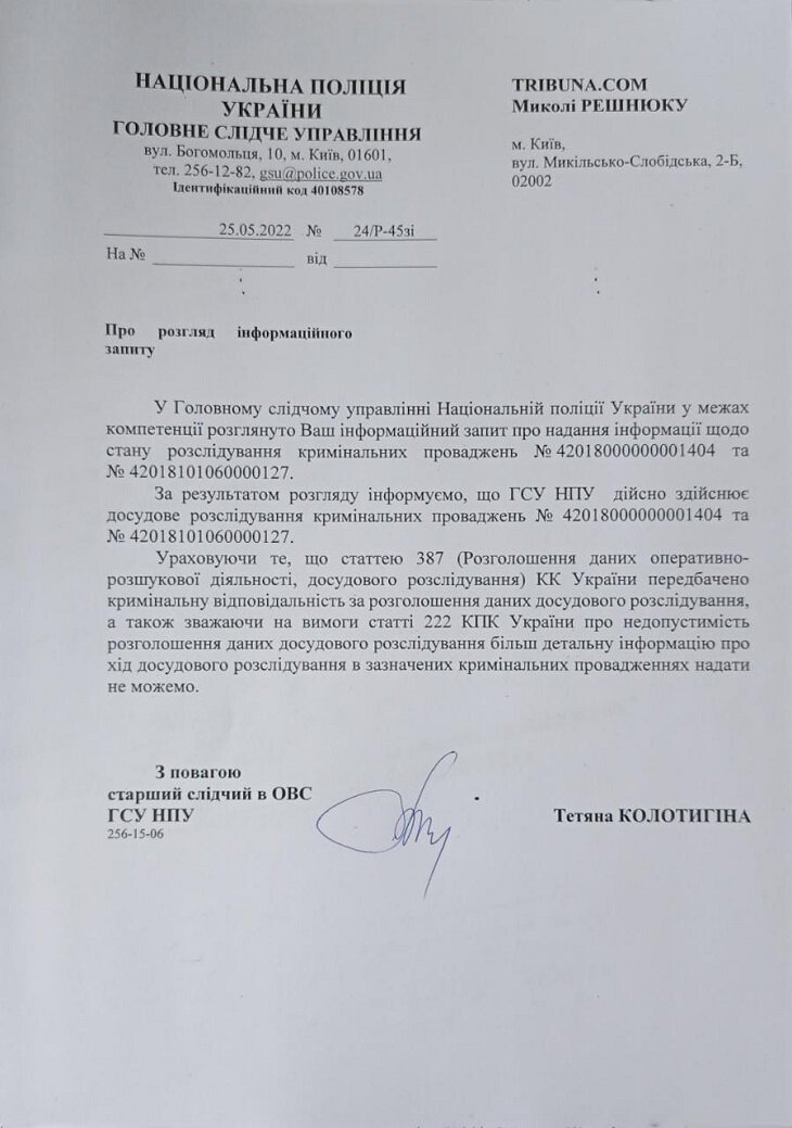 От Нацполиции оперативный ответ получить не удалось — ее ведомство направило только недавно, через несколько месяцев после нашего запроса. Но и она повторила ответ Генпрокуратуры (хотя ничего удивительного, ведь речь идет об одних и тех же производствах).