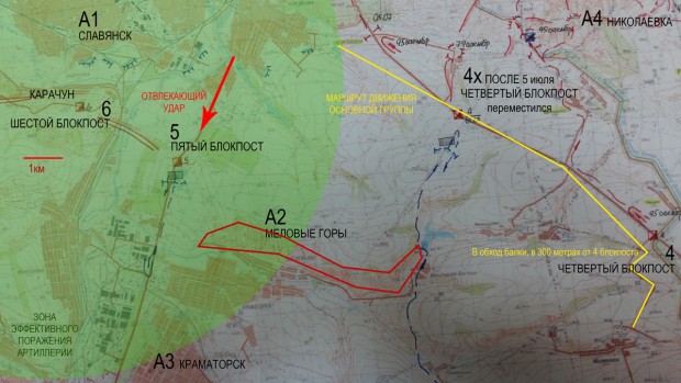 Одна колонна со Славянска выходила на пятый блокпост(5), где её в течение ночного боя положили с блокпоста, а также артиллерией с Карачуна(6) и с Красного Лимана. Вторая колонна боевиков обошла четвертый блокпост(4) и за пределами видимости четвертого блокпоста обходными путями (см. карту) вышла в Краматорс(А3)к. В Краматорске ВСУ стояли только на аэродроме, Краматорск тогда не контролировался полностью. Когда колонна ночью вошла в Краматорск она вступила в огневой контакт с ВСУ, которые стояли на аэродроме. Вот как описывает этот бой жительница Краматорска Татьяна: