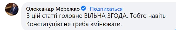 "В этой статье главное свободное согласие. То есть, даже Конституцию не надо менять", - написал в комментариях Мережко.