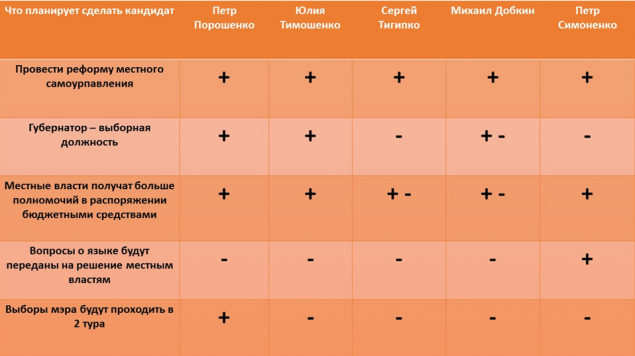 Так, Петр Порошенко (33%) обещает, что «общины на местах получат больше прав и денег на реализацию полномочий». Также он декларирует, что, ежели станет главой государства, не будет назначать губернаторов, передав это право облсоветам. Также компаньон Виталия Кличко выступает за проведение выборов мэров в два тура.