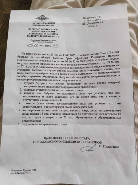 Любовь Коваленко решила добиваться справедливости в полиции, но ее там заверили, что состава преступления в этой ситуации не видят, поэтому в возбуждении уголовного дела отказали. Тогда сестра оккупанта написала заявление в военкомат, пытаясь добиться выплаты компенсации за погибшего брата. Судя по дате ее обращения — 15 июня, она надеялась, что выплату просто продублируют, но в военкомате девушке ответили, что "гробовые" ей не положены.