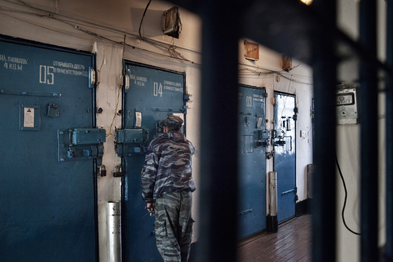 Охранник смотрит в глазок на двери камеры, внутри — потенциальный суицидник