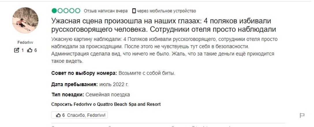 "Ужасную картину наблюдали: 4 Поляков избивали русскоговорящего, сотрудники отеля просто наблюдали за происходящим. После этого не чувствуешь тут себя в безопасности. Администрация сделала вид, что ничего не было. Жаль, что за такие деньги еще приходится такое видеть", — оставил отзыв FedorIvv.