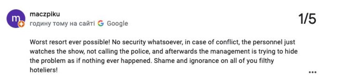 "Худший курорт из возможных! Охраны никакой, в случае конфликта персонал просто смотрит шоу, не вызывая полицию, а потом руководство пытается скрыть проблему как ни в чем не бывало. Позор и невежество всем вам, грязным отельерам!" — пишет пользователь "maczpiku".
