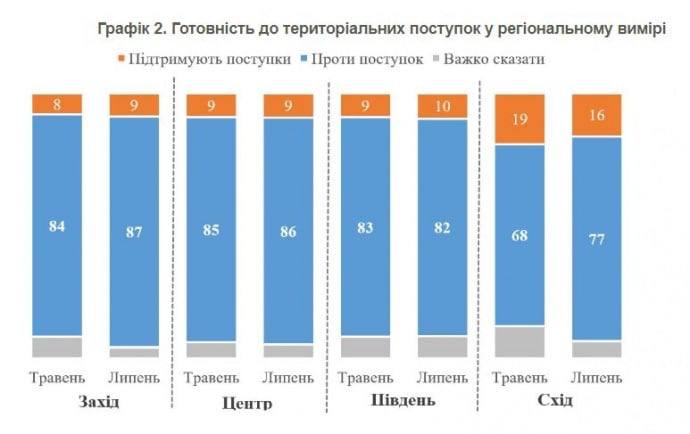 Опрос показывает, что в этом вопросе мнения украинцев практически не изменились с мая, число неготовых к уступкам выросло на 2%.