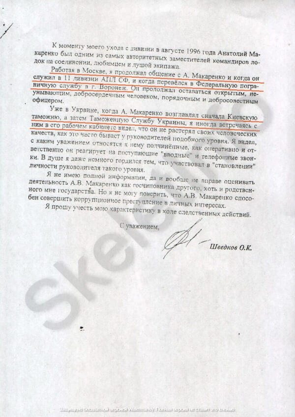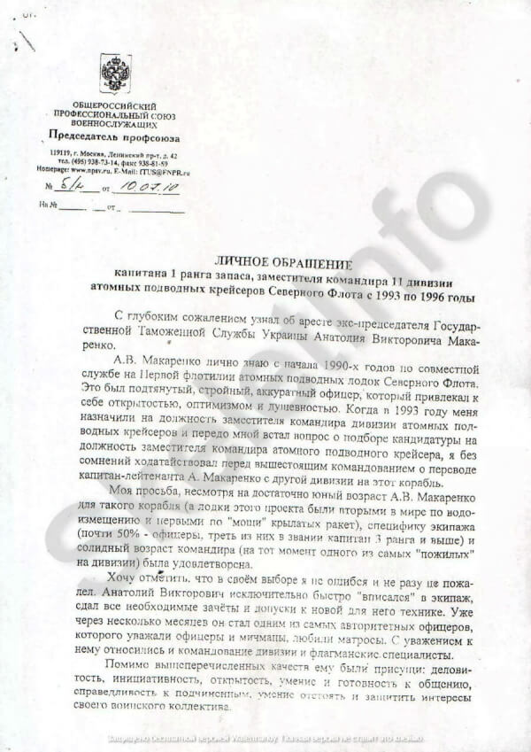 Нет в его биографии ничего и о том, что служил Макаренко не боевым офицером, а советским замполитом, в начале 90-х став российским заместителем командира по работе с личным составом. Что не только ставит под сомнение его дутый имидж «воина» и «стратега», но и, как мы заметили выше, вызывает вопрос о его сотрудничестве с КГБ-ФСБ. Кроме того, подробности первых семи лет службы Макаренко на Северном флоте остаются неизвестными, поскольку его назначение на К-148 «Краснодар» произошло только в 1993-м. О чем свидетельствует любопытный документ — личное обращение российского капитана 1-го ранга в отставке Олега Шведкова, сделанное им в июле 2010 года в защиту арестованного тогда Анатолия Макаренко.