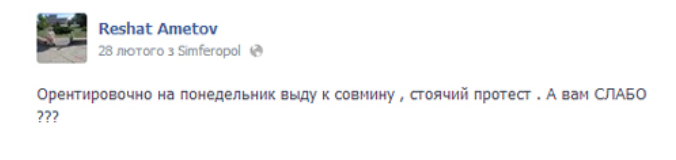 Первой гражданской жертвой российского вторжения в Украину стал крымский татарин Решат Аметов . 3 марта 2014 года он, как простой гражданин, вышел с одиночным пикетом в здание захваченного крымского правительства. В 12:00, напротив здания, на глазах у всех, он был схвачен и вывезен машиной. Мужчину пытали и убили, его тело нашли только через две недели в лесу в 60 километрах от Симферополя. По словам брата, смертельный удар был нанесен ударом ножа в глаза. У Решата Аметова осталось трое детей.