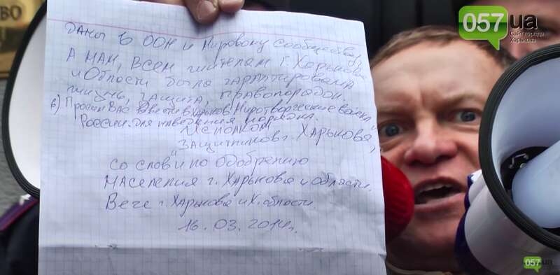 На иллюстрации «Моторола» (третий справа), Харьков, 16 марта Тогда он стоял рядом с оратором, который произносил обращение «народу Харькова и области» с просьбой Путину «ввести миротворческие войска для наведения порядка».