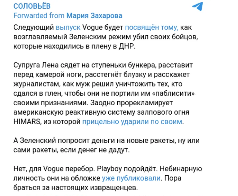 Подключили даже Захарову, которая вдобавок к уже упомянутым обвинениям добавила еще и "хейту", по поводу фотосессии Елены Зеленской для Vogue.