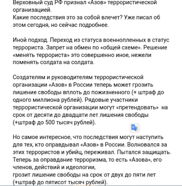10 июля русско-фашистский пропагандист Стариков написал у себя в телеграмме: " Общественность хочет суда над нацистами. Так вот, первый суд уже прошел и вынес свой приговор. Двух членов батальона "Азов" приговорили к смертной казни. Оба убивали, в том числе пленных. Оба вели соцсети и, по сути, сами себе наработали высшую меру".