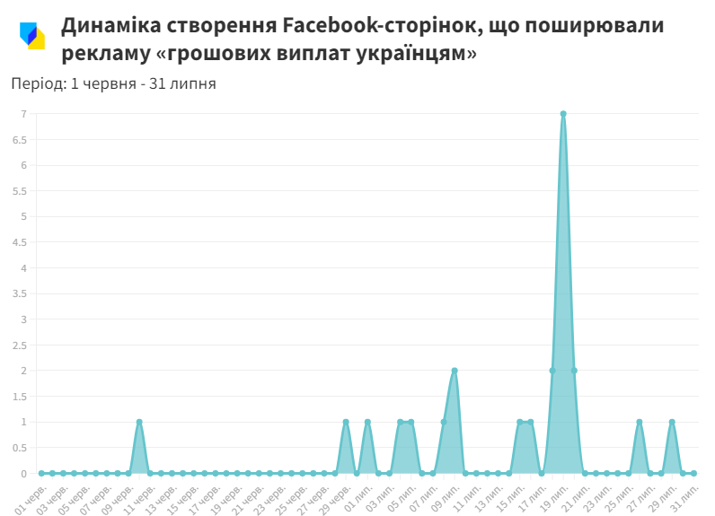 Отслеживание таких рекламных сообщений с 1 мая по 31 июля указывает на достаточно большую продолжительность кампании, а максимальный пик ее пришелся на июль. К тому же анализ фейсбук-страниц, на которых запускали такую рекламу, указывает на вовлечение их в общую сеть. Часть сети уже заблокирована, но многие страницы все еще активны.